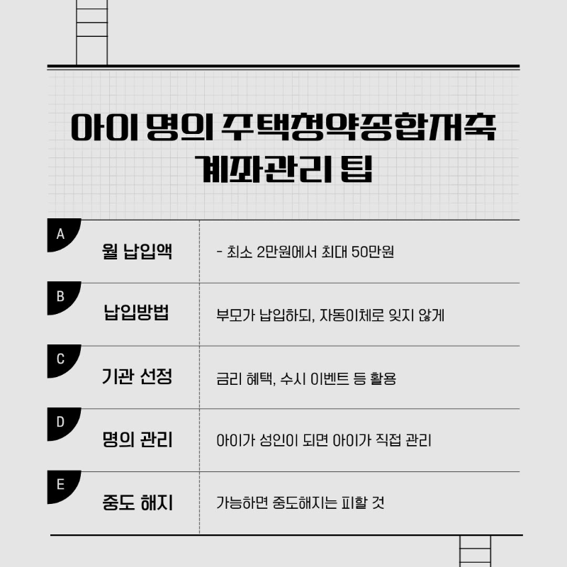 특히 아이가 어릴 때부터 꾸준히 납입하면 청약 가점에 큰 도움이 되며, 만기 해지 없이 유지하는 것이 핵심입니다.