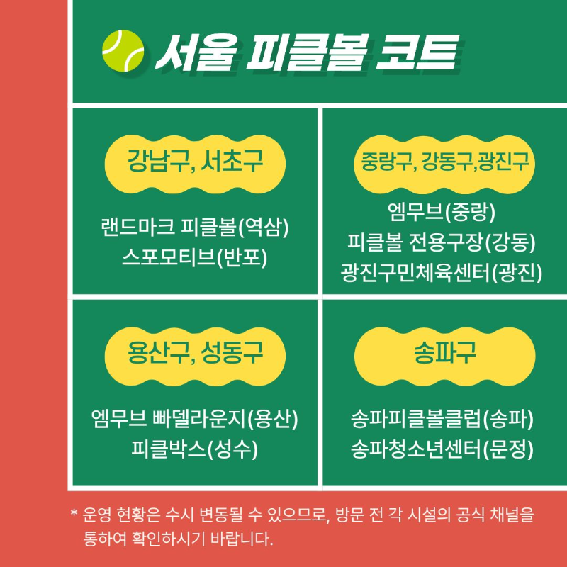 이상으로 서울에서 피클볼을 즐길 수 있는 피클볼 코트들에 대하여 살펴보았습니다.