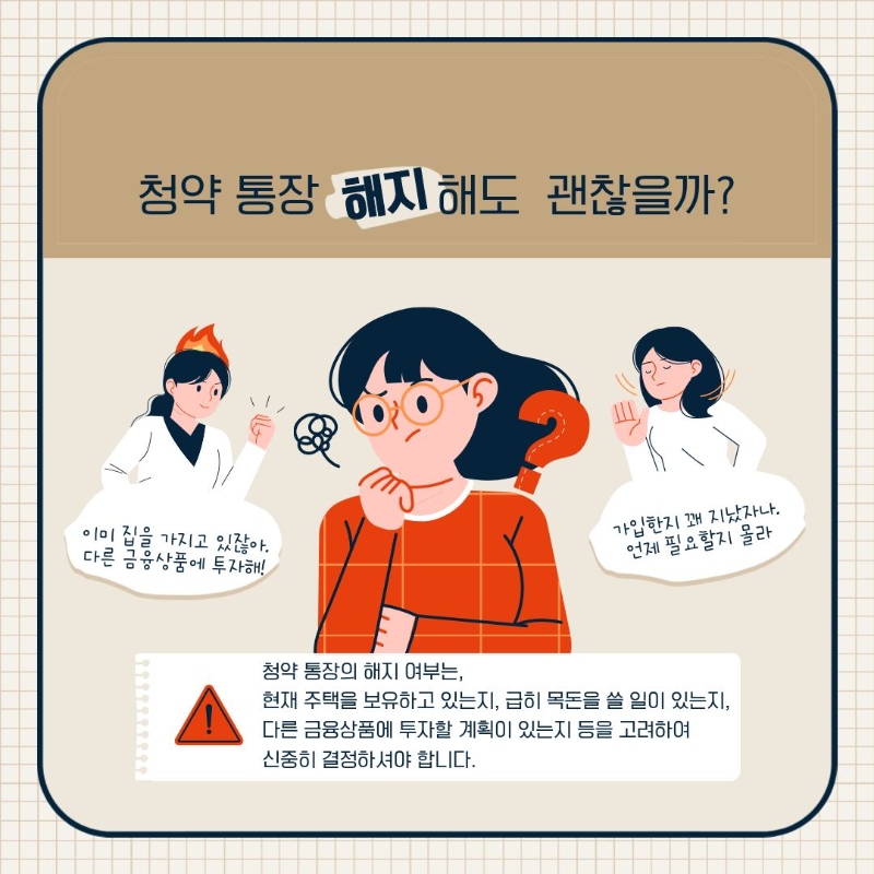 많은 분들이 고민하는 부분이 바로 청약 통장을 해지할지 말지입니다. 의사결정의 기준은 다음과 같이 정리할 수 있습니다.