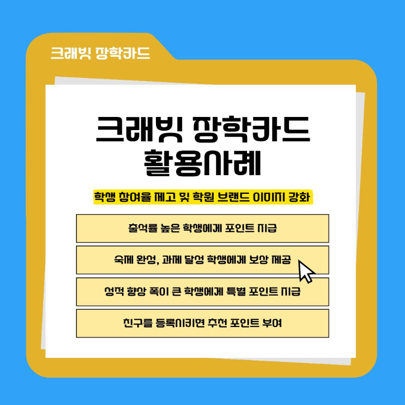 학생들에게 동기를 부여하고, 학원 운영에 창의적 마케팅 요소를 추가할 수 있는 아이템으로 ‘크래빗 장학카드’가 화제입니다.