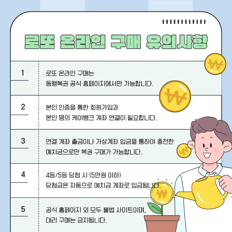 반드시 본인 명의 계좌를 사용해야 하며, 미성년자는 온라인 로또 구매가 불가능합니다.
