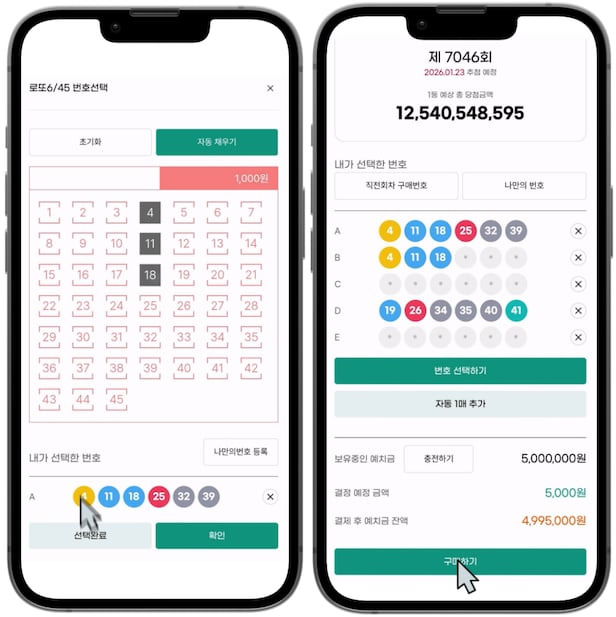 로또6/45를 선택하고, 번호를 자동 또는 수동으로 선택합니다.