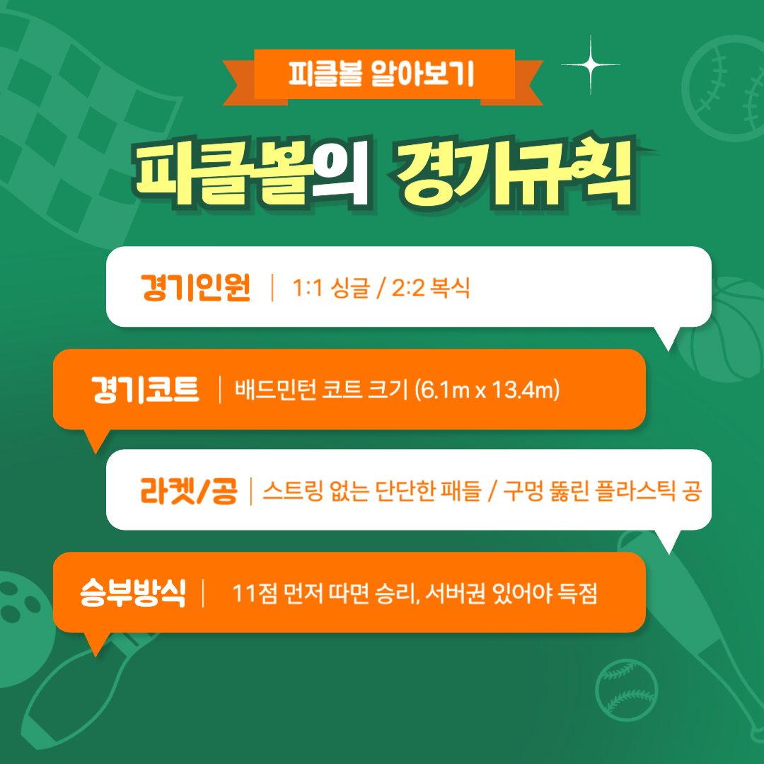 피클볼은 1965년 미국 워싱턴주에서 탄생한 라켓 스포츠로, 배드민턴의 코트 크기에 탁구와 테니스의 요소를 결합한 형식입니다.
