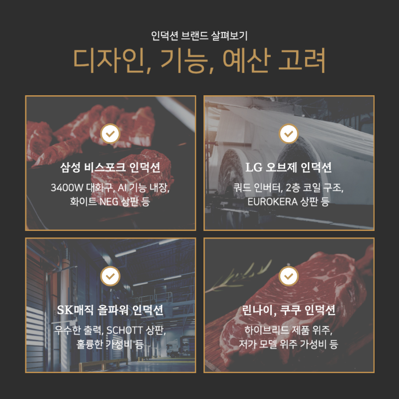 대부분의 가전기기들이 그렇듯이 디자인과 성능을 모두 잡고 무난한 선택을 하고 싶다면 삼성 인덕션 (비스포크)나 LG 인덕션 (오브제컬렉션) 모델이 가장 합리적인 선택일 것이라고 생각합니다.
