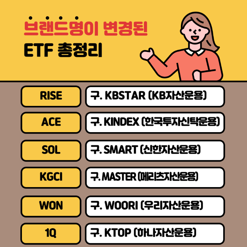위의 정리표를 보면, 여러 ETF들이 브랜드명을 바꾼 것을 확인할 수 있습니다.