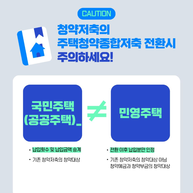 - 국민주택(공공주택) 청약 시 청약저축 납입 횟수와 금액은 전환 시 그대로 인정됩니다.