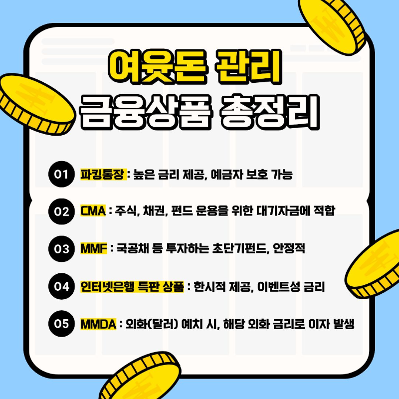 파킹통장, CMA, MMF, 인터넷특판 상품, 외화 MMDA 계좌 등 다양한 대안을 활용하면 언제든 꺼내 쓰면서도 금리를 챙길 수 있습니다.